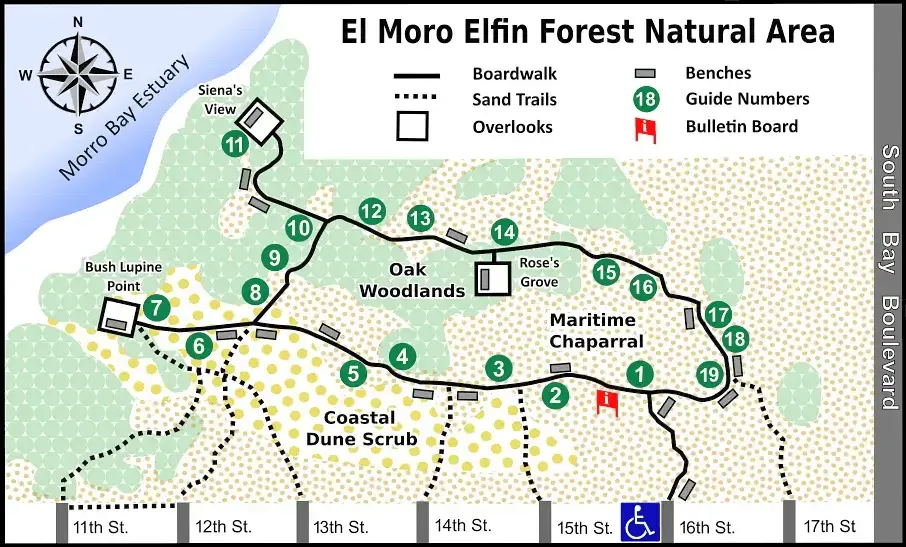El Moro Elfin Forestis a 90-acre natural area belonging to San Luis Obispo County Parks and California State Parks. A four-fifths of a mile boardwalk loop, constructed in 1999, provides wheelchair access and protects sensitive habitat. Plant communities include coastal brackish marsh, riparian woodland, oak woodland, maritime chaparral, and coastal dune scrub. The forest supports more than 200 species of plants, 110 kinds of birds, 22 species of mammals, and 13 species of reptiles and amphibians. It is home to rare plants, butterflies, snails, and birds. Chumash middens occur throughout the Elfin Forest. | |